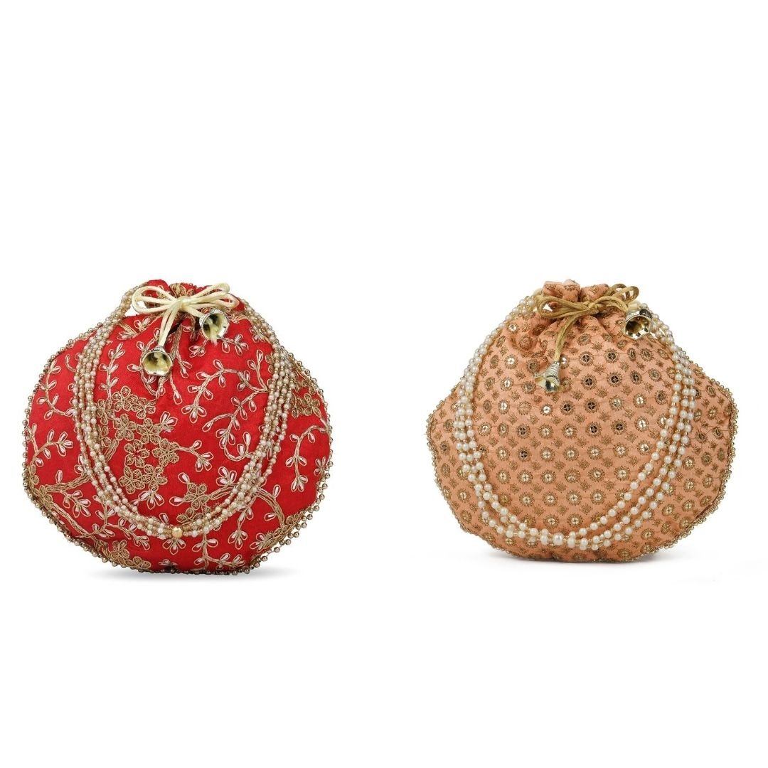Combo – Designer Embroidered Potli Bag – Red & Beige