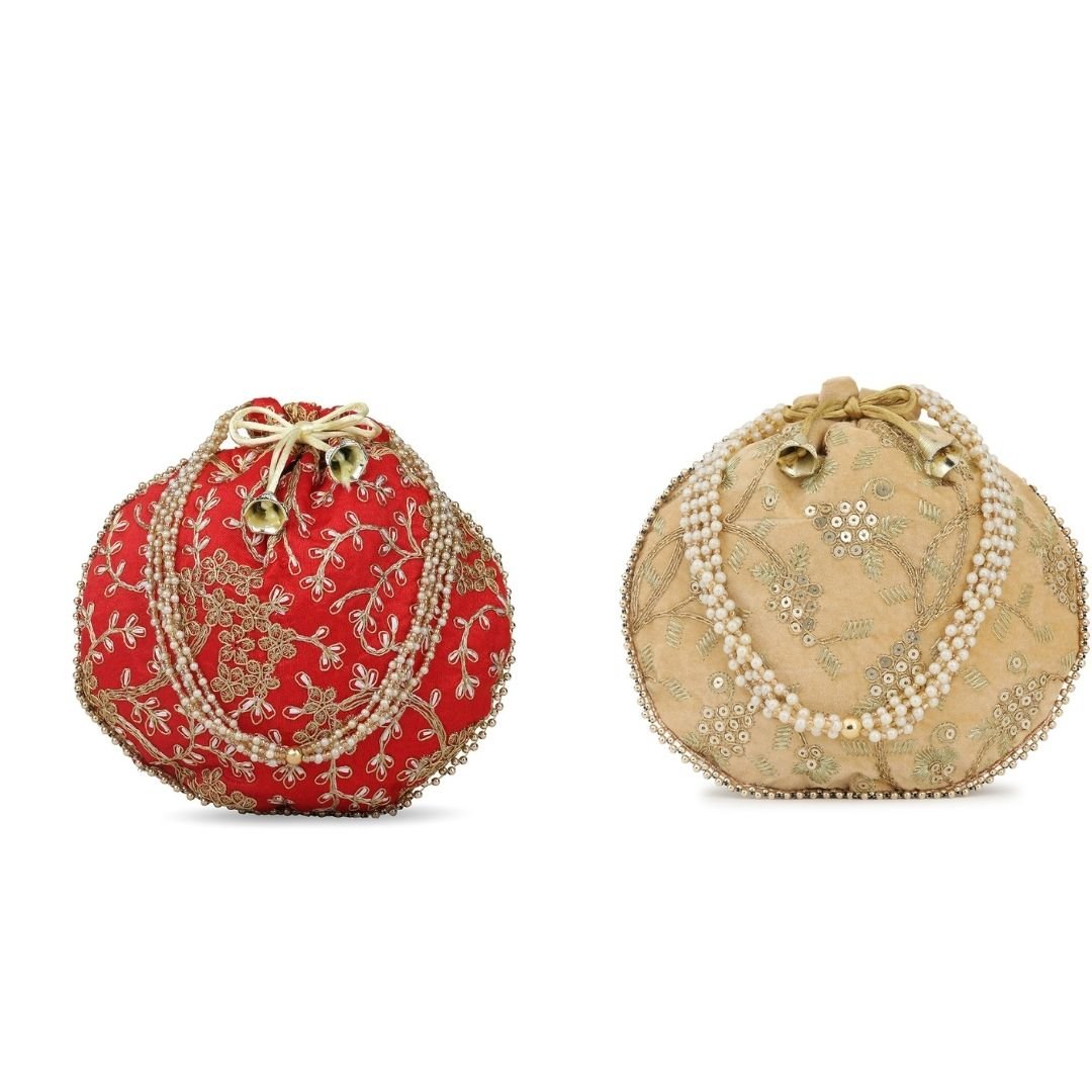 Combo – Designer Embroidered Potli Bag – Red & Beige